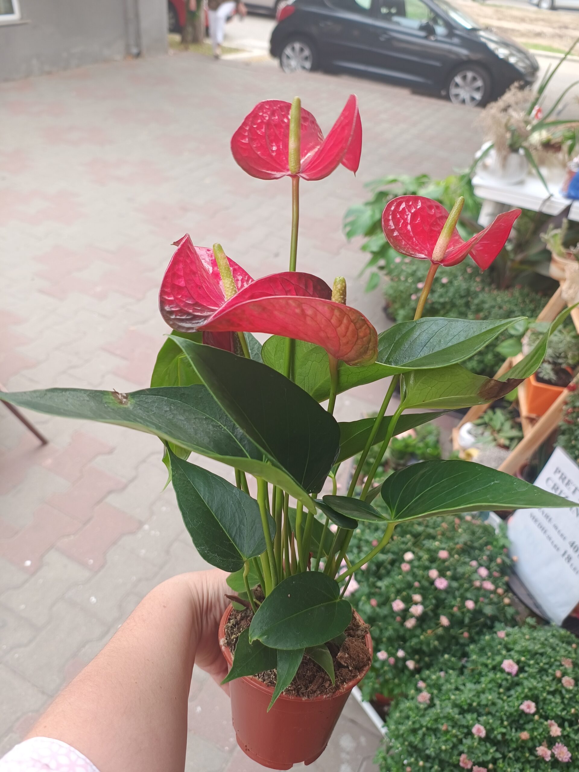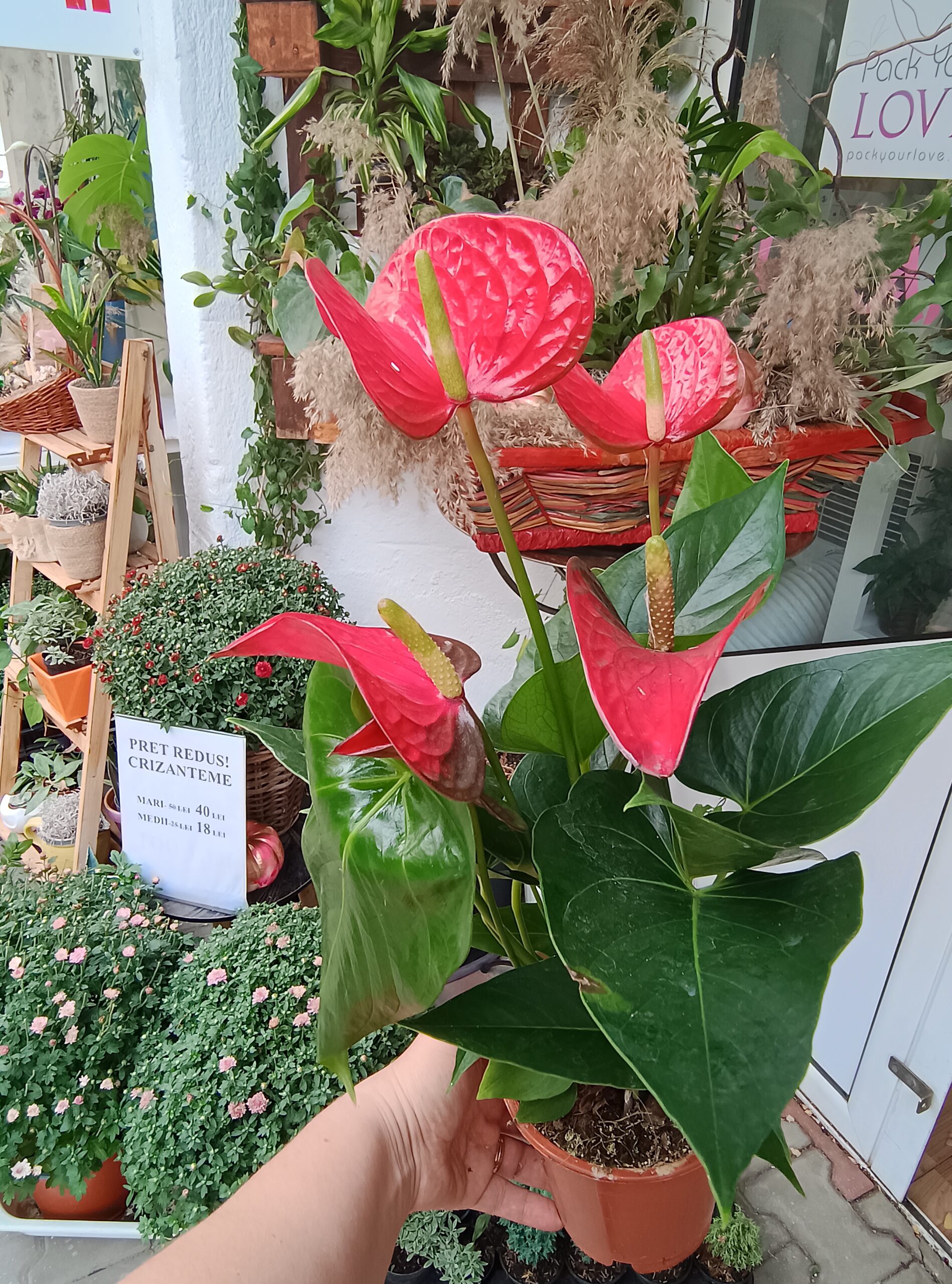 Exemplare magnifice, cu mai multe tije florale, flori roșii, superbe. Anthurium este o planta foarte ușor de îngrijit, iubește apa și umiditatea, suporta și lumina mai slabă, însă iubește lumina intensa, filtrata. Ea face că florile sa fie lucioase și intens colorate.