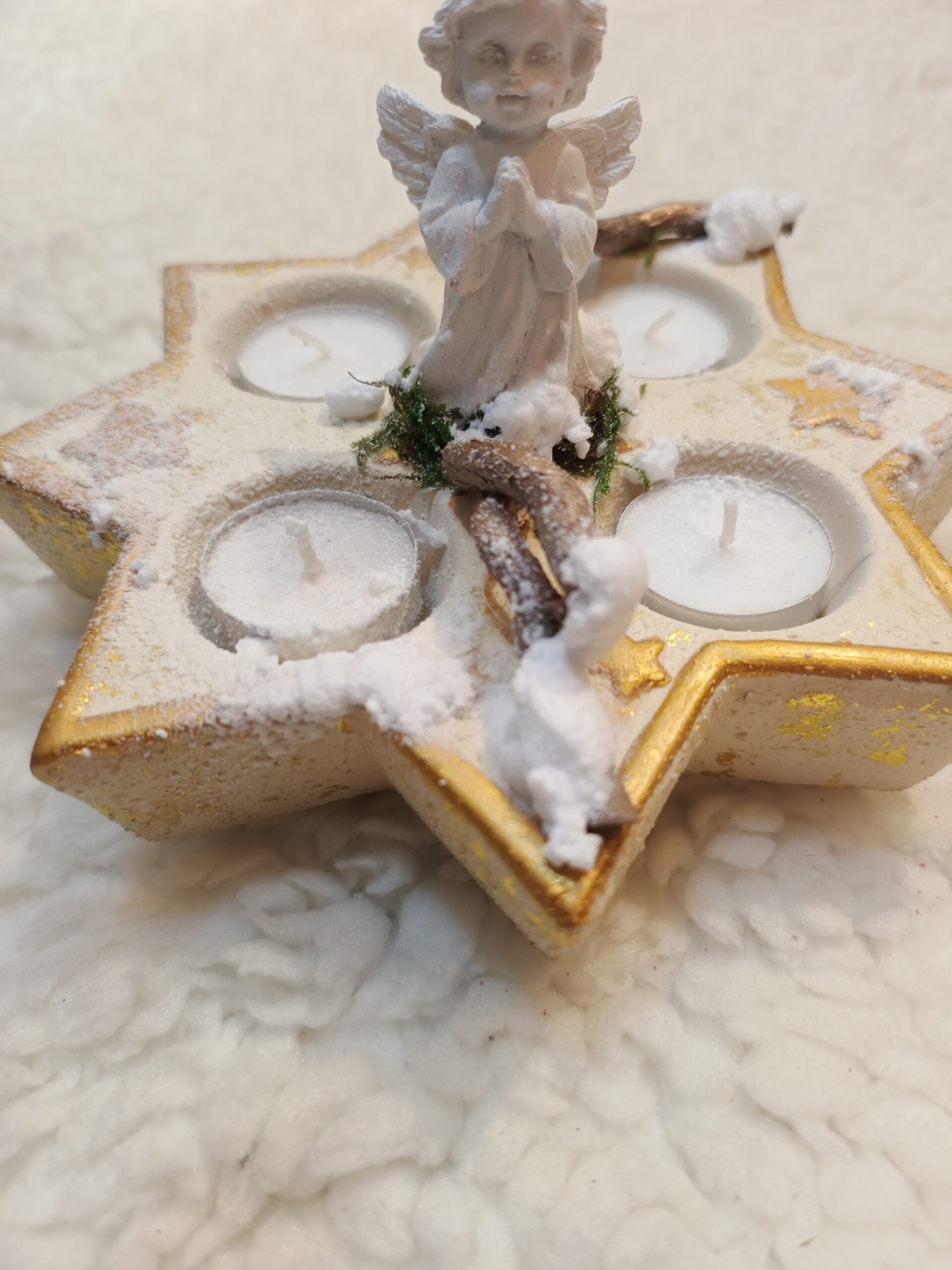 Aranjament Advent din ceramica, cu îngeraș ceramic și crengi decorative. Diametru aproximativ 35 cm.