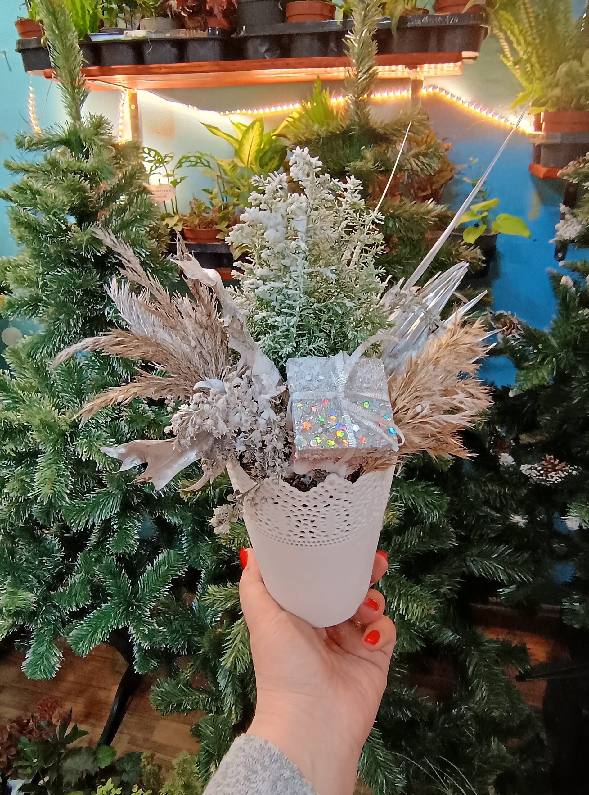 Aranjament de Crăciun cu brăduț natural in ghiveci și alte elemente decorative.