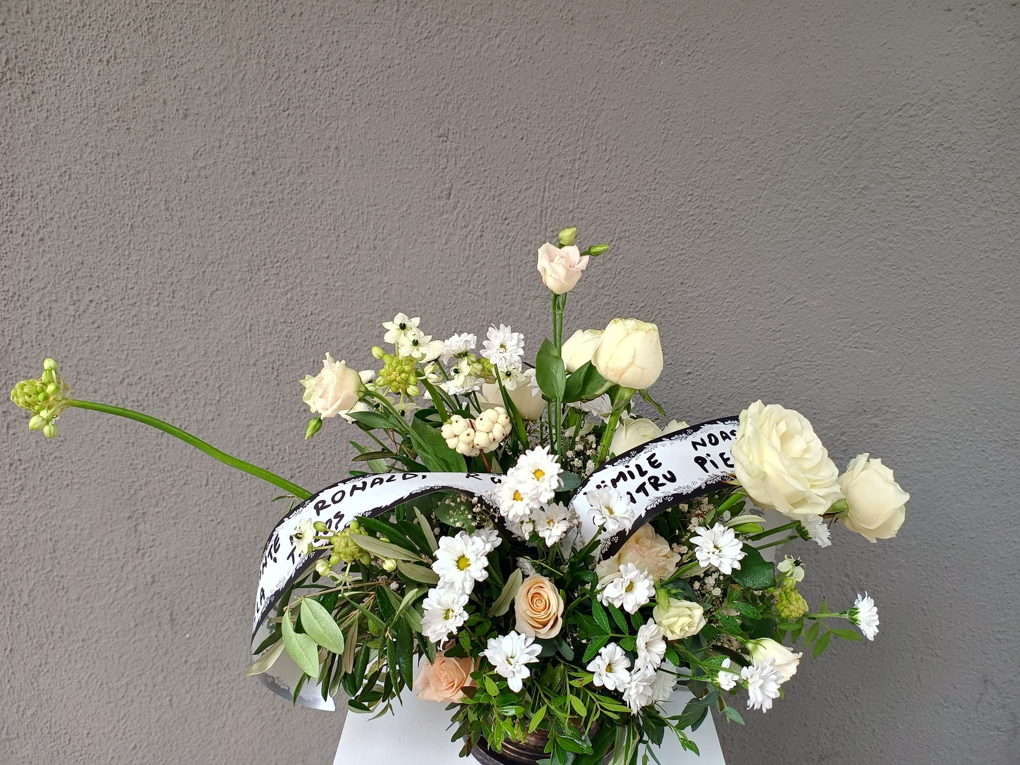 Aranjament funerar tip urna realizat din flori naturale. Un mod elegant de a fi alaturi de o familie in momentele cele mai dificile din viața lor.