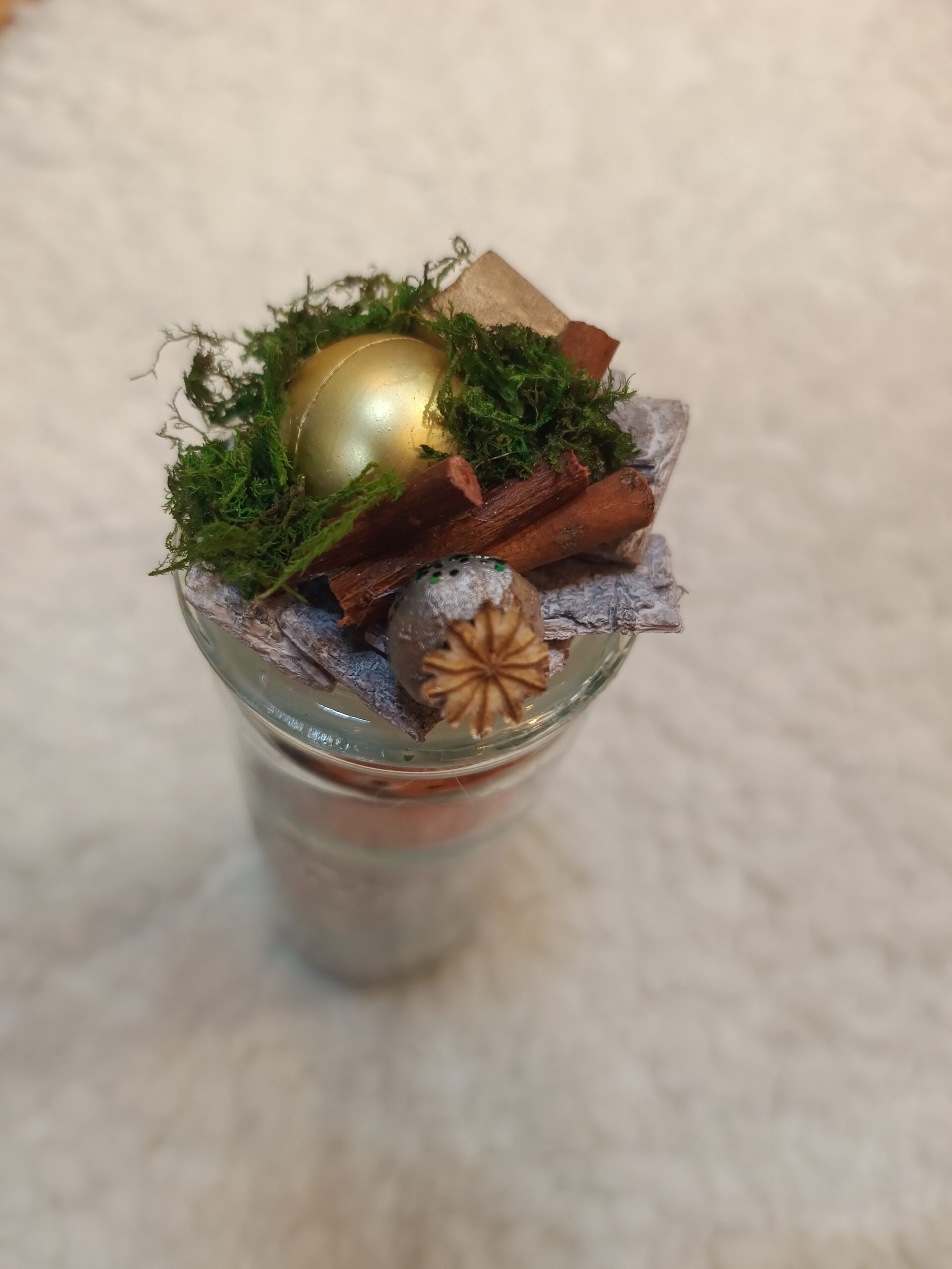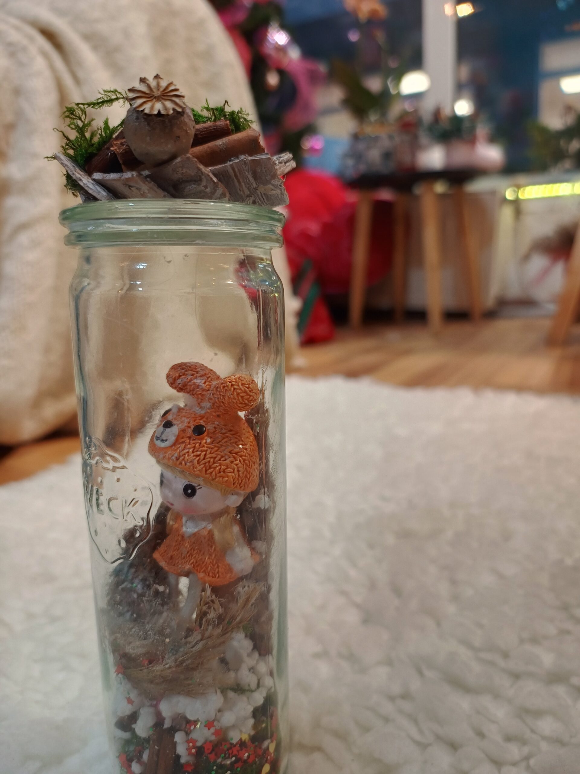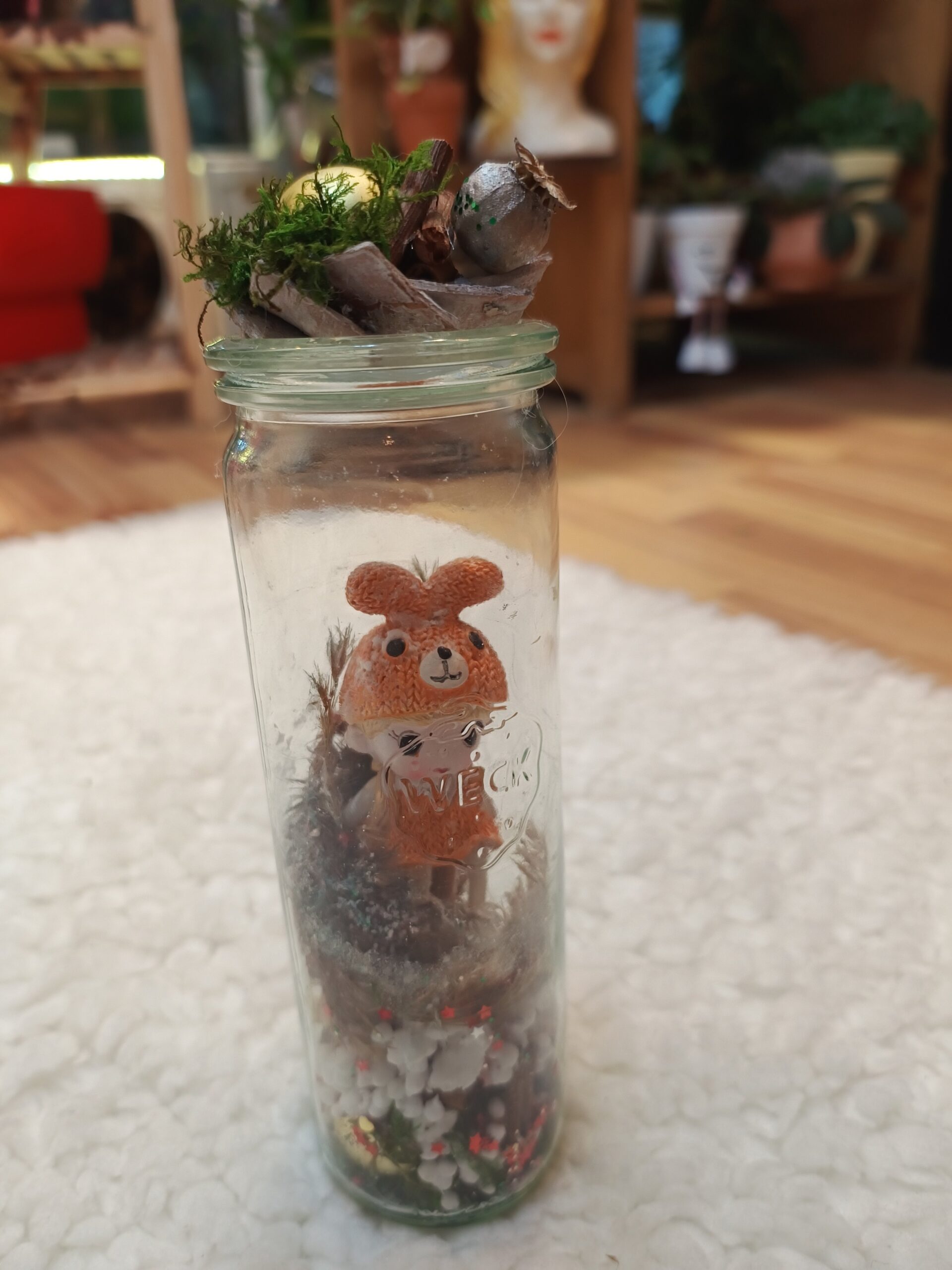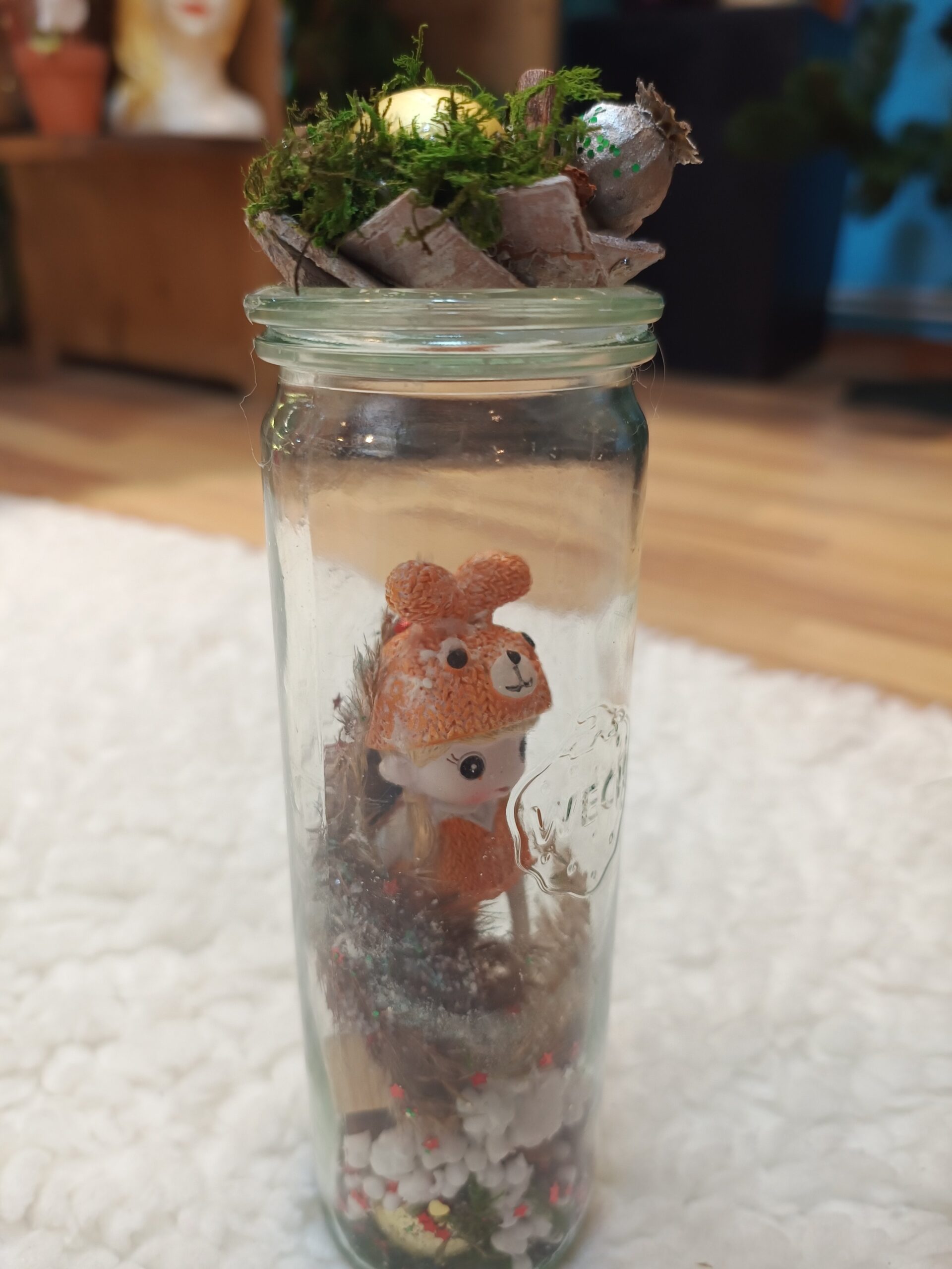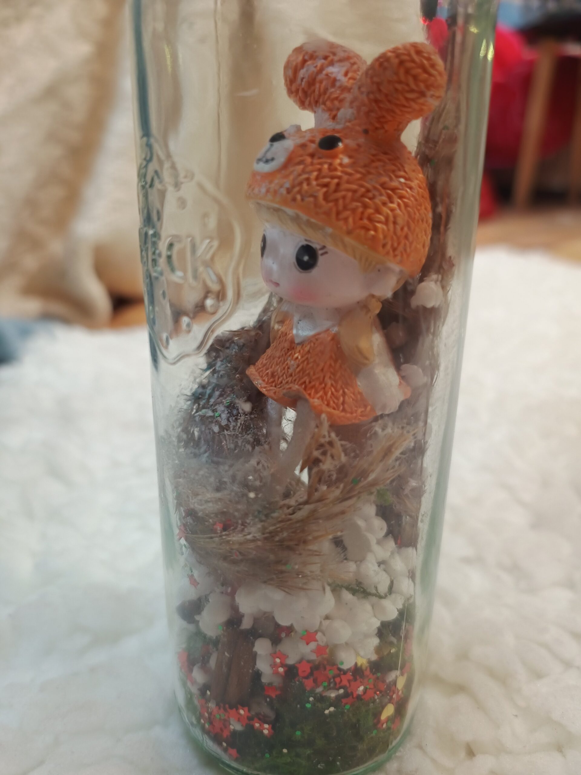 Aranjament cu fetița ceramica in vas de sticla decorat. Înălțime totală aproximativ 30 cm.