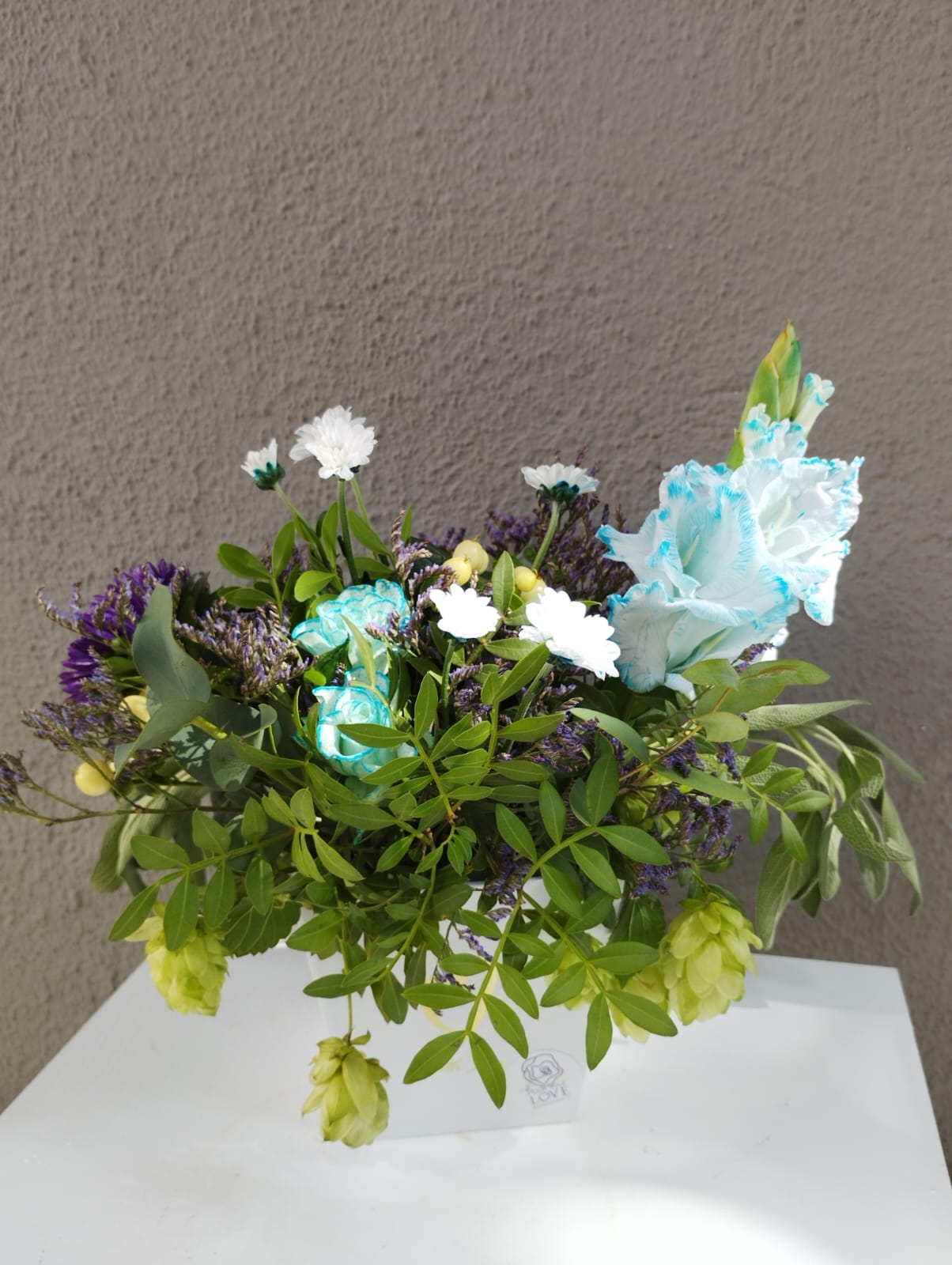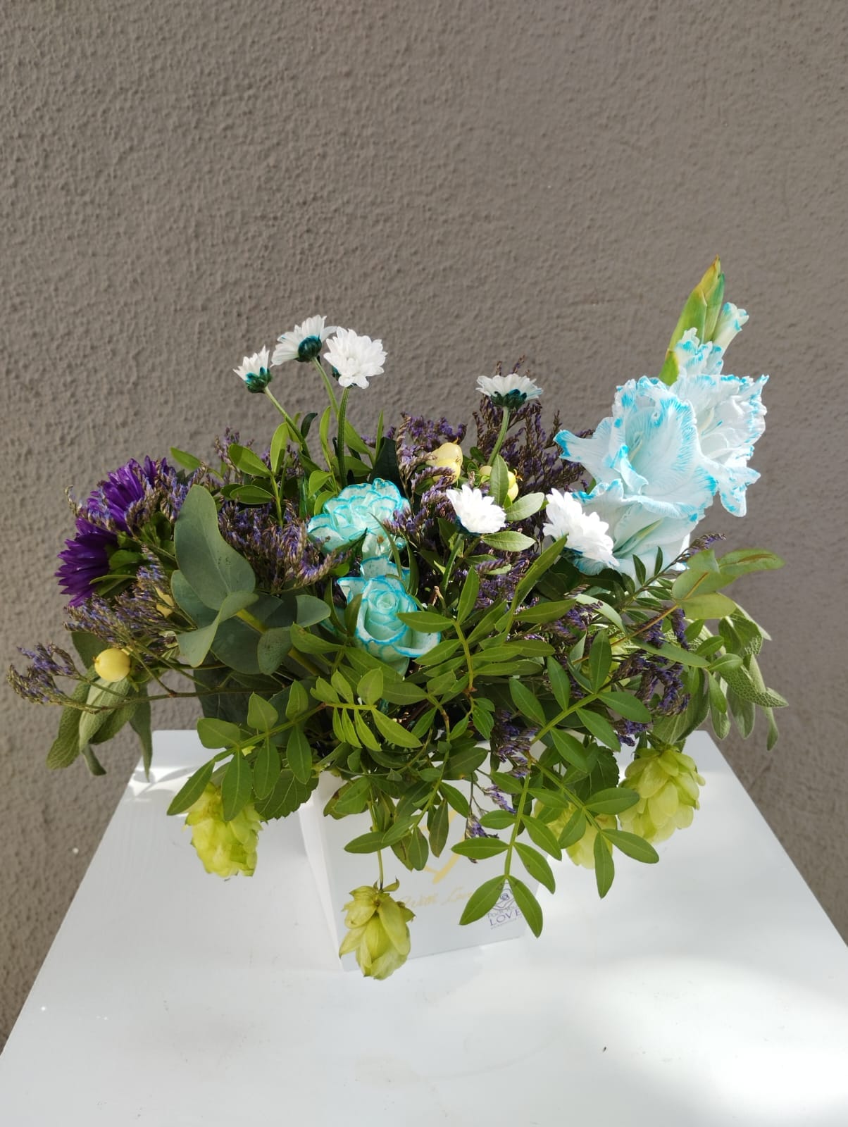 Aranjament in cutie patrata din carton, cu flori naturale de sezon. Cutia are un latura de 10 cm, inaltime totala aproximativ 25-30 cm. Gama cromatica o alegeti dumneavoastra, iar noi vom pune cele mai frumoase si proaspete flori, astfel incat sa surprindeti placut destinatarul. Ce poate fi mai frumos decat sa oferi flori naturale celor dragi? Bucuria pe care o aduc, zambetul larg si lacrimile de fericire nu pot fi comparate cu nimic. De aceea florile noastre sunt atent alese si armonizate de designerii nostri floristi astfel incat sa aduca emotie si fericire. Nu sunt doar flori, ci sunt bucurie, zambete si emotii!
