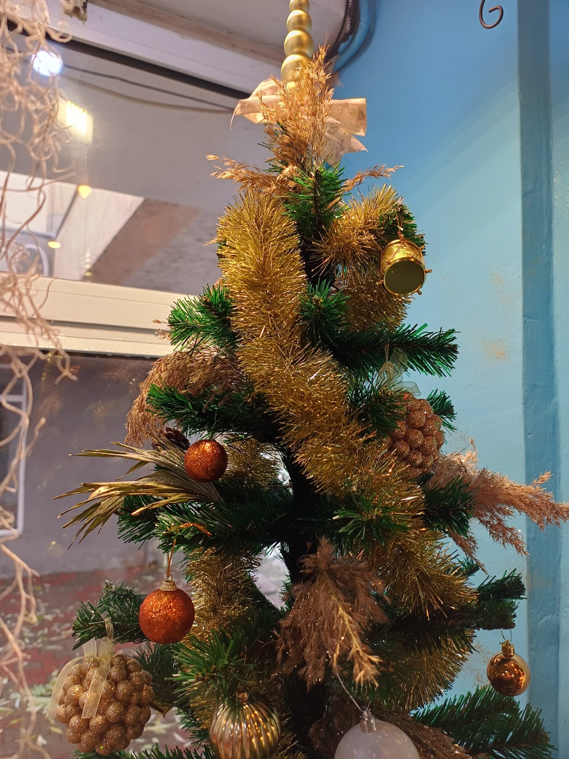Brad artificial gata decorat, in nuanțe de auriu. Înălțime totală 1,6 m.