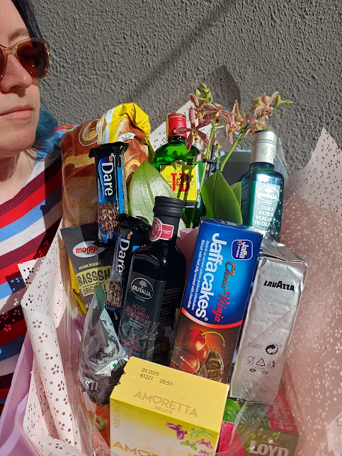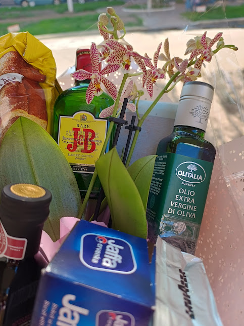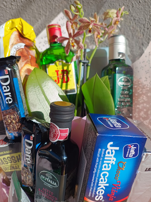 1. *Selectarea produselor alimentare:* Alegem o varietate de produse alimentare preferate ale beneficiarului, cum ar fi ciocolată fină, bomboane, biscuiți, nuci, fructe uscate sau chiar mini-sticle de vin sau șampanie, ceai sau cafea etc, în funcție de gusturile și preferințele acestuia.