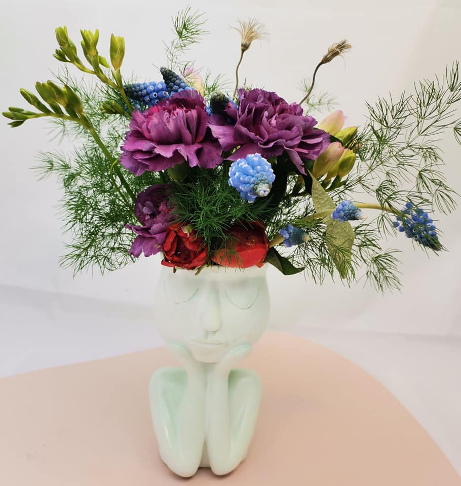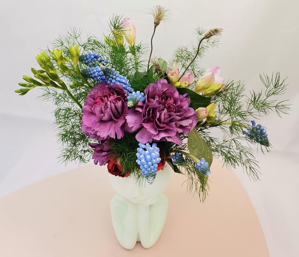 Aranjament cu flori naturale, in vaza din marmura lichida. Ulterior, vaza poate fi folosita ca masca pentru ghiveci, suport pentru pensule de machiaj, pentru creioane sau bijuterii.