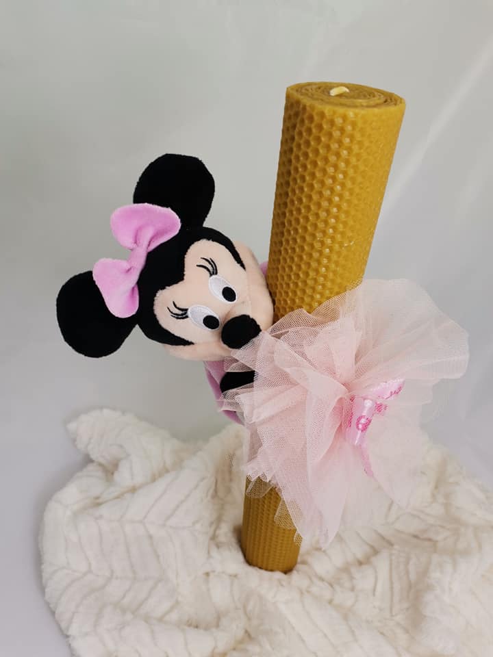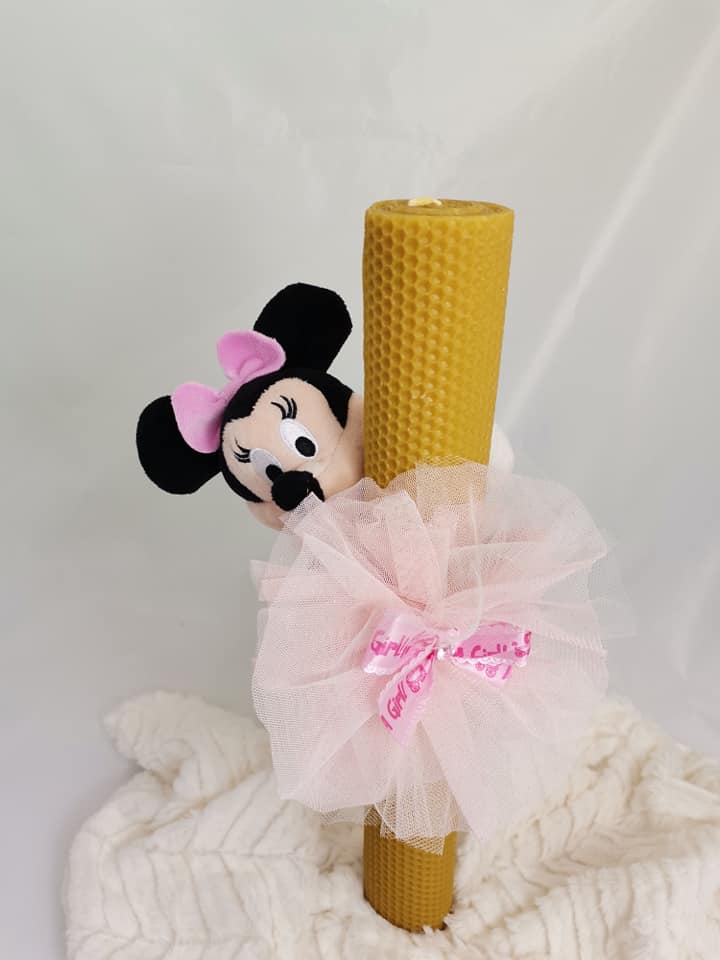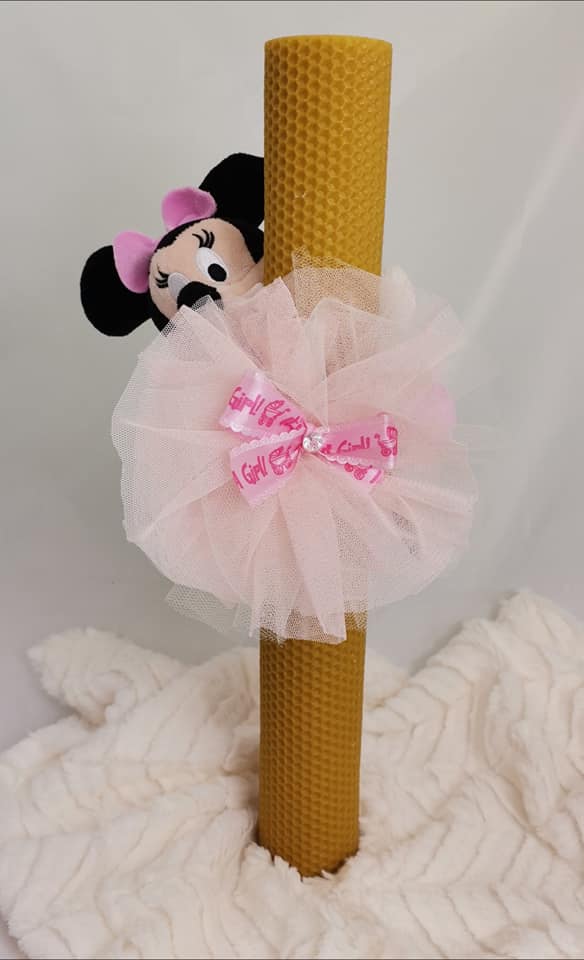 Lumanare botez din ceara naturala, model fagure, decorata cu jucarie din plus si pampon din tulle.