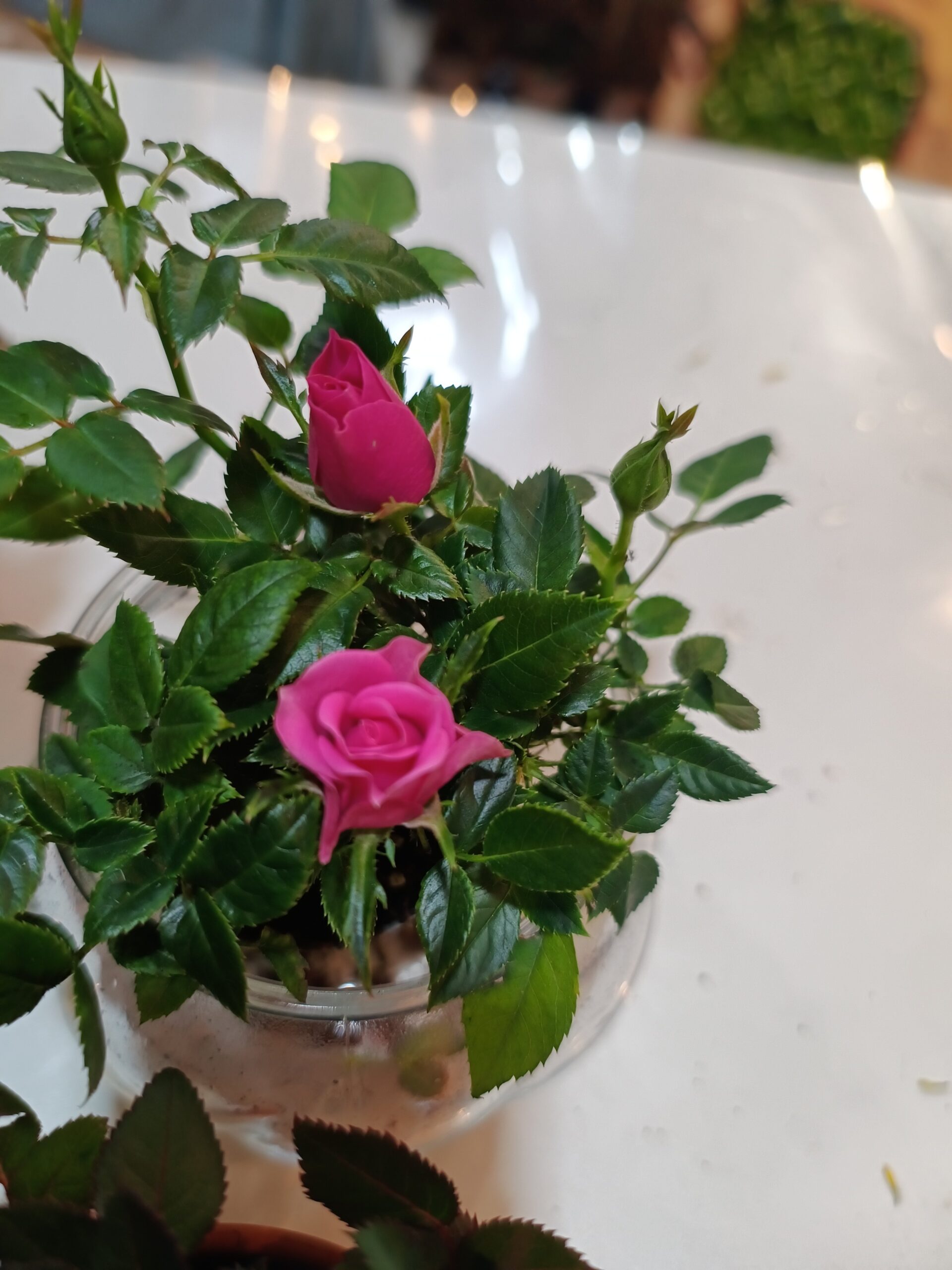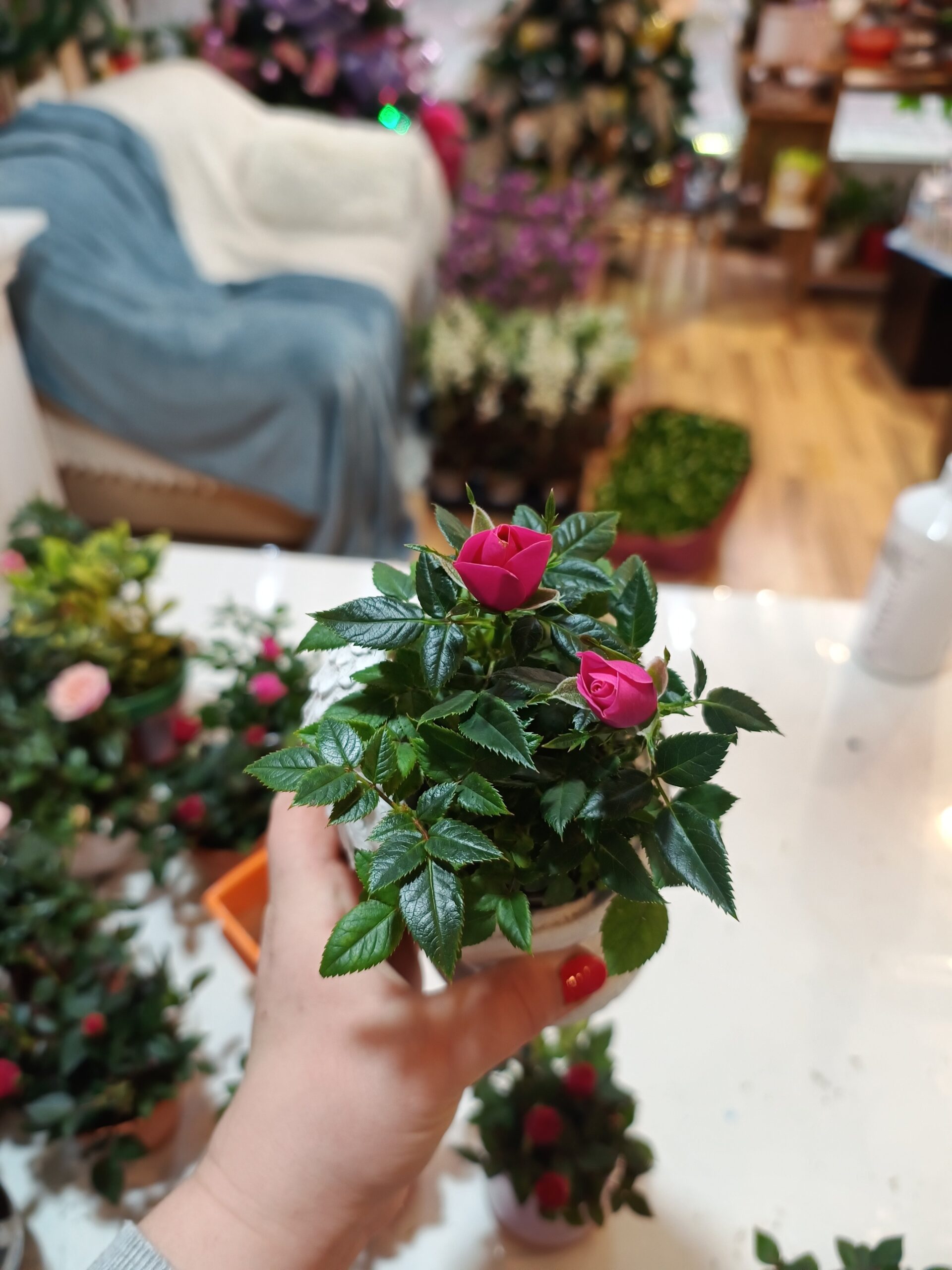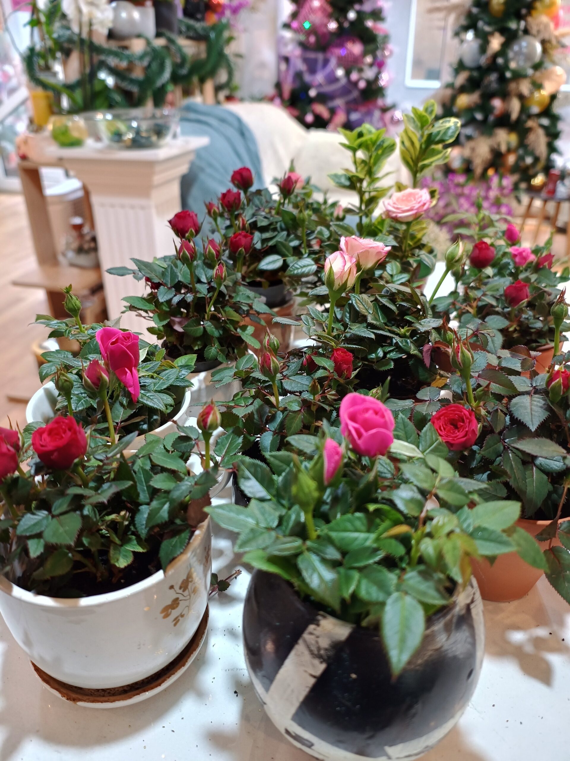 Trandafiri mini in ghiveci de 6 cm, înălțime totală aproximativ 20 cm. 3 culori disponibile, roșu, roz fucsia și roz pal dantelat.